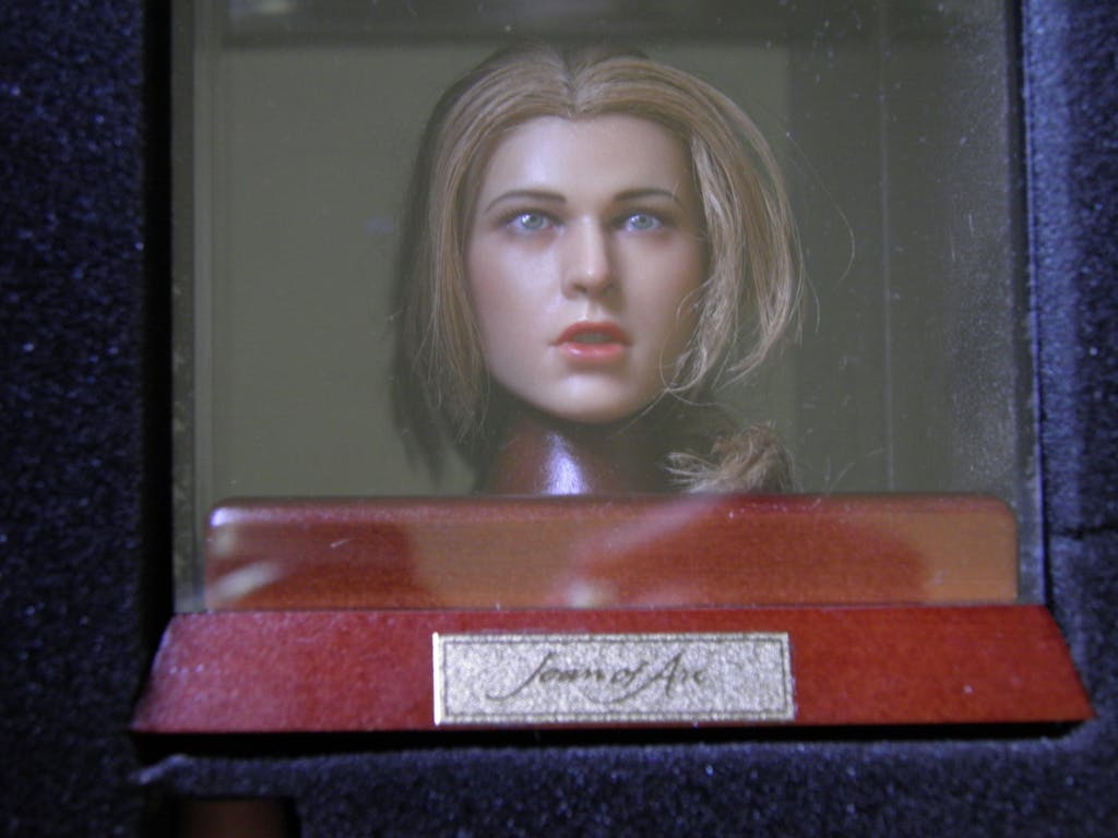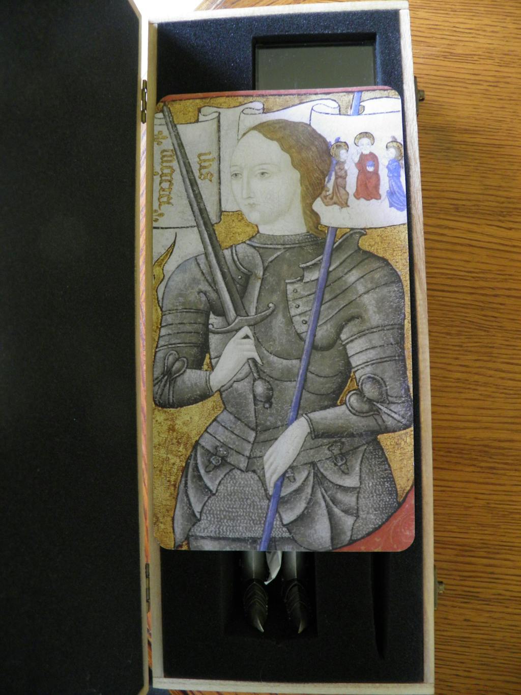 Belle version de Jeanne d'Arc présentée dans un coffret en bois.